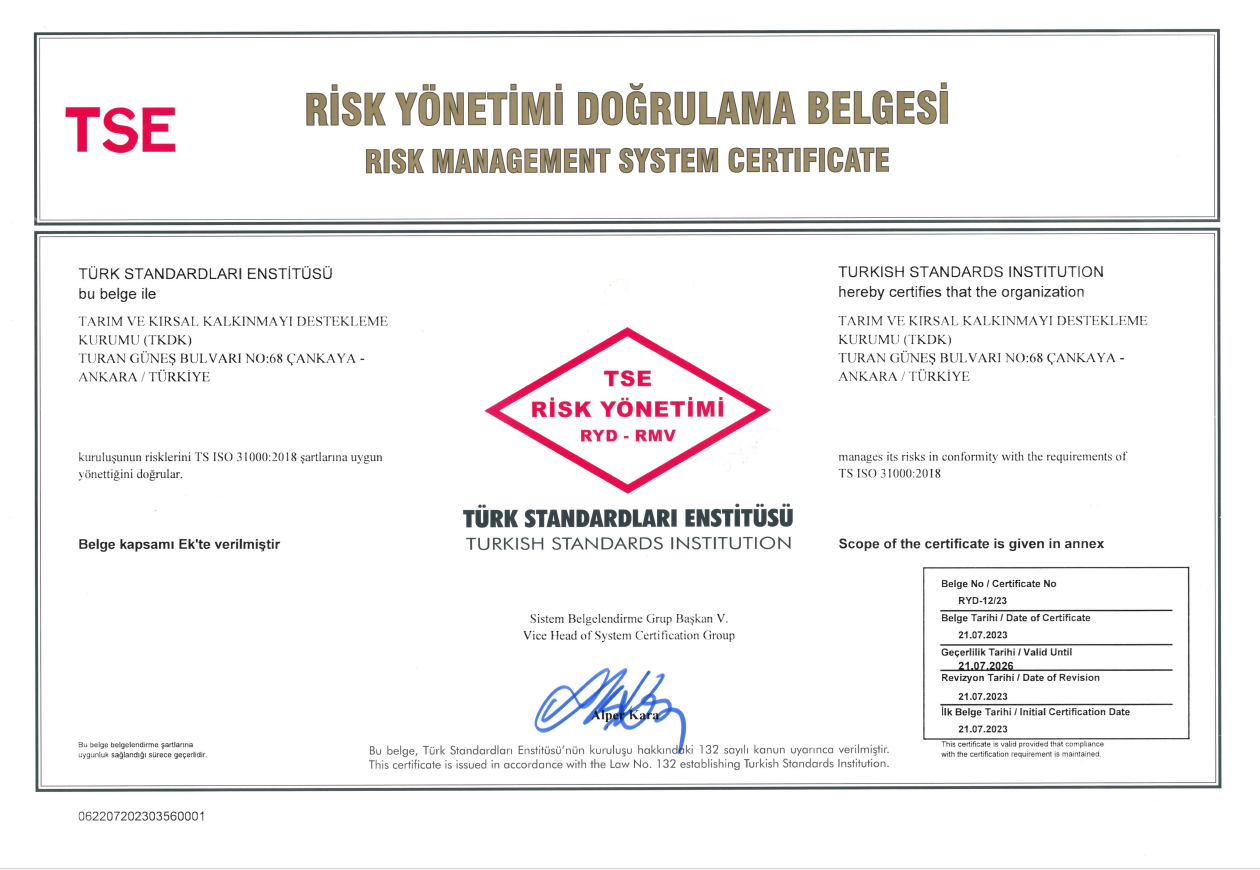 Projenin amacı, TKDK’nın risk yönetimi ve stratejik planlama alanındaki kurumsal kapasitesinin COSO ERM ve ISO 31000 uluslararası risk yönetimi standartlarına uygun olarak güçlendirilmesidir. 2021 -2023 yılları arasında uygulanan proje kapsamında, bütünleşik bir kurumsal risk yönetimi ve stratejik planlama çerçevesinin oluşturulmuş, ilgili prosedürler güncellenmiş, Kuruma özgü bir risk yönetimi yazılımı gerçekleştirilmiş ve Kurum personeline kapsamlı eğitimler verilmiştir.